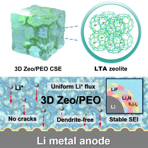 针对上述问题,于吉红教授团队提出了一种新的复合固态电解质设计策略:通过将三维互通的A分子筛网络引入含锂盐(LiTFSI)的聚乙烯氧化物(PEO)基体中,成功构筑了高性能的3D Zeo/PEO复合固态电解质。研究结果表明,三维分子筛网络在复合电解质中不仅为锂离子提供了连续、高效的传输通道,而且通过分子筛与聚合物及锂盐之间的路易斯酸碱相互作用,有效促进了锂盐的解离并抑制了聚合物的结晶行为,从而显著提升了离子传输性能。在室温条件下,该复合电解质的离子电导率可达1.62 × 10−4S cm−1,电化学稳定窗口拓宽至5.7 V(vs. Li+/Li),远优于传统的PEO基固态电解质(3.23 × 10−6S cm−1, 4.9 V)。同时,三维分子筛网络结构能够有效调控锂离子沉积行为,并诱导形成以LiF、Li3N和LixSy等无机组分为主的稳定固态电解质界面层(SEI)。因此,基于该复合电解质构建的锂对称电池在室温下实现了长达2300小时的稳定循环(过电势仅为0.13 V);组装的全电池同样表现出优异的倍率性能和长期循环稳定性(室温下500次循环后容量保持率高达92%)。该研究工作通过材料选择与结构设计的协同调控,为构筑兼具高离子电导率、优异界面稳定性和良好安全性的复合固态电解质提供了一种可行策略,对推动新一代高安全、高能量密度全固态锂金属电池的实际应用具有重要意义。