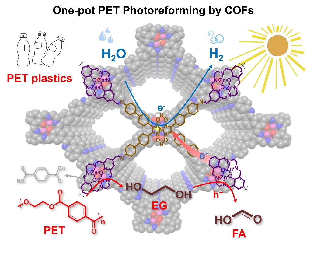 图1. COFs作为功能集成材料一锅法直接光重整PET机制示意图
